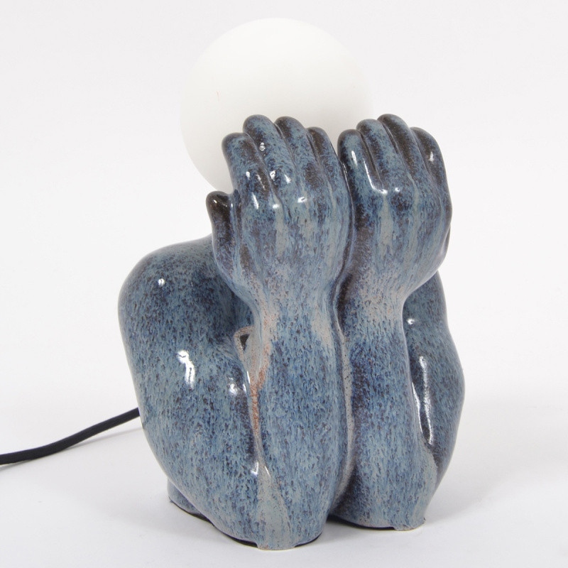 La lampe ANSSA TWO Personnage bleu séduit par son design unique : une silhouette en céramique bleue, les mains posées sur le visage, surmontée d’une ampoule globe LED qui diffuse une douce clarté.