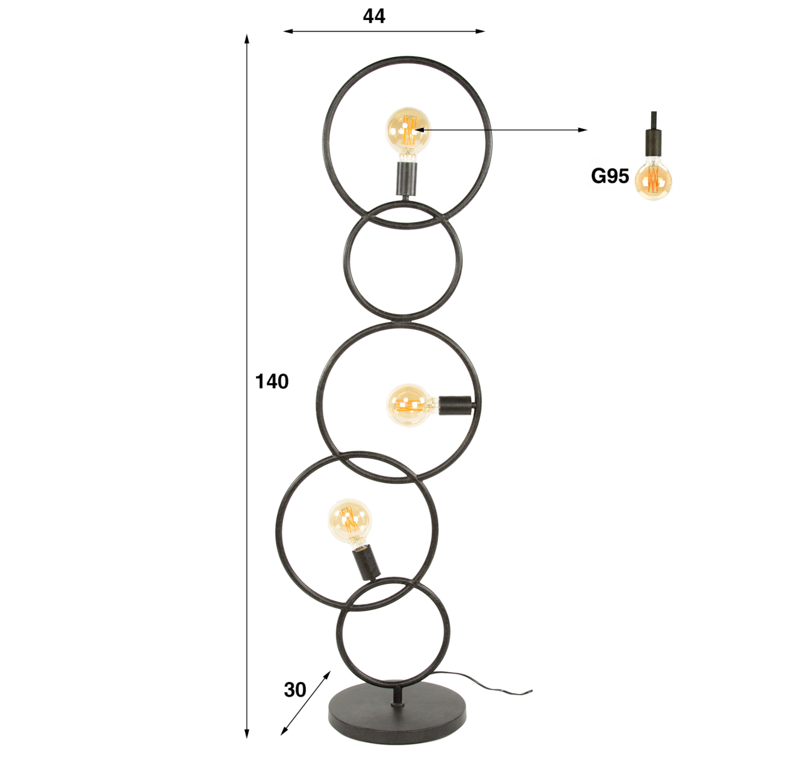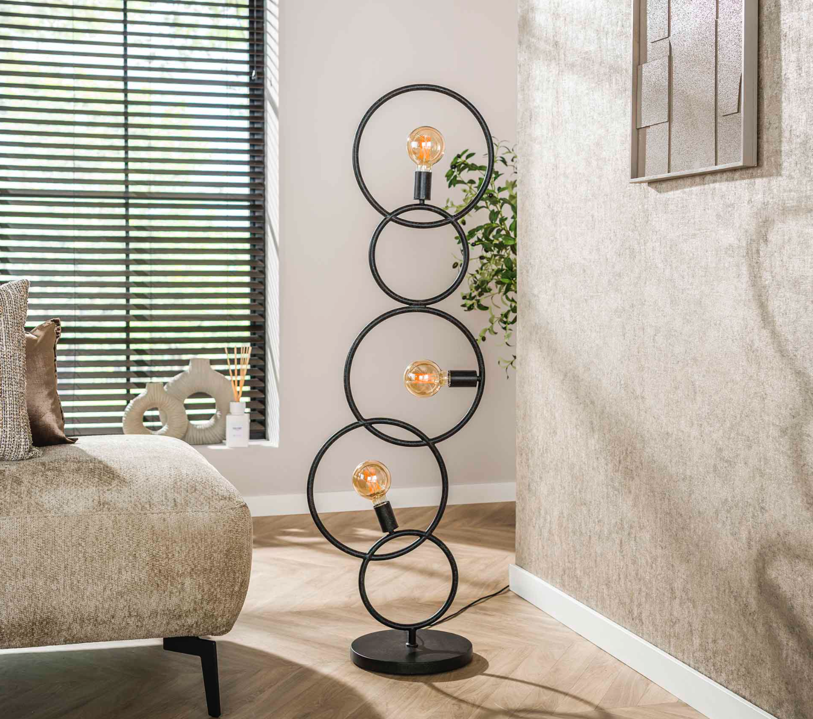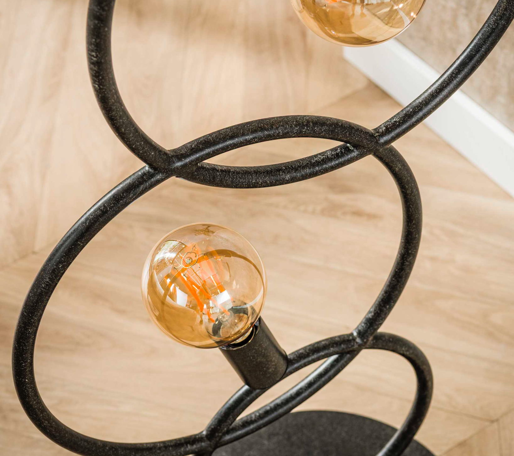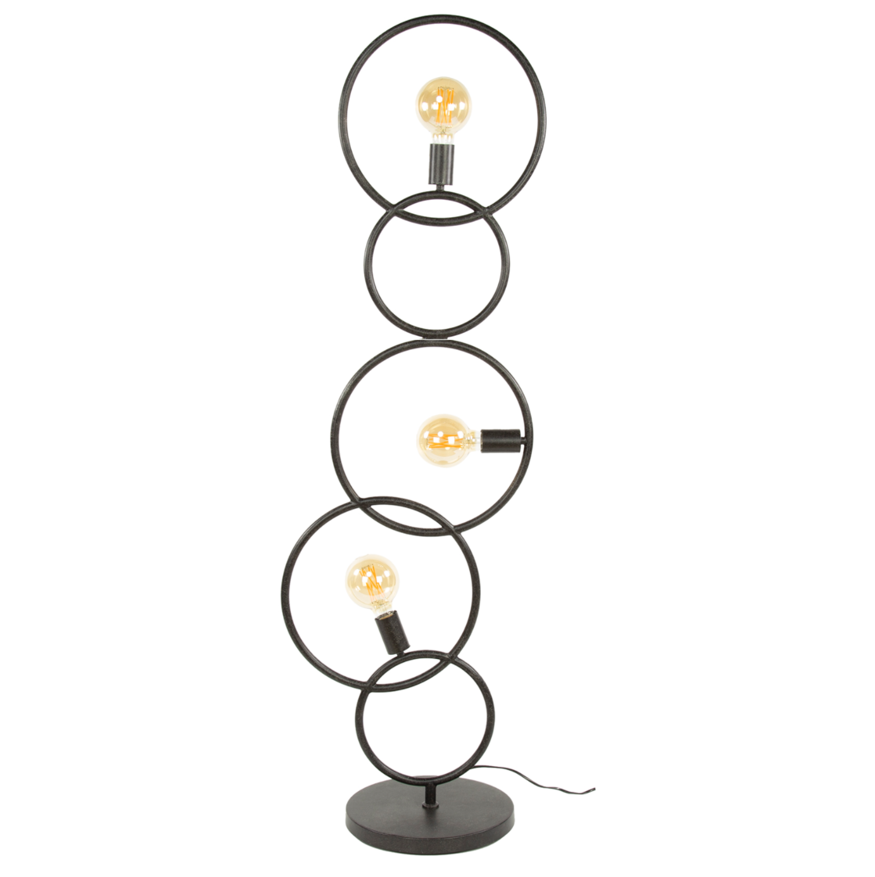 Composé de quatre cercles en métal noir reliés en équilibre, il séduit par son design sculptural et sa lumière chaleureuse. Ses ampoules apparentes à filament créent une ambiance cosy et élégante, idéale dans un salon, une chambre ou un bureau.
